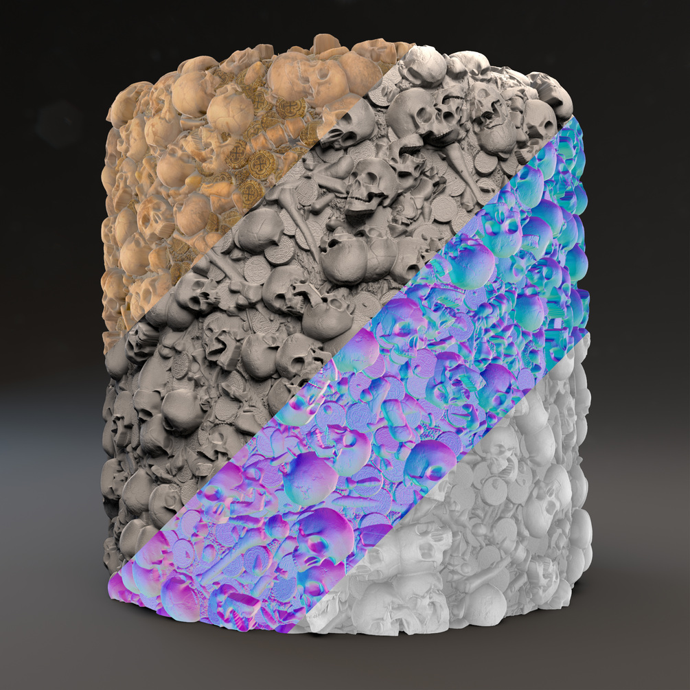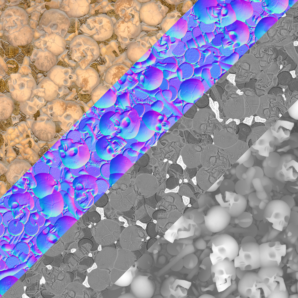 The creation Flow of Skeleton Pile Material should be divided into two different workflows, the Height and the Color creation. From which I also obtained the Normal, Ambient Occlusion, Curvature and Roughness Maps.